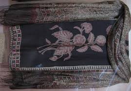 Deskripsi : Terdiri dari kain dan selendang sutera, warna coklat tua dan muda. Motif kembang, burung, belah ketupat dan arsirat garis menyerupai sisir. Tumpal motif kembang mawar yang sedang berbunga. Ujung selendang bermotif arsiran garis gelombang dan diberi rumbai berpilin. Biasa dipakai pada acara resmi, seperti pernikahan.