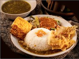 Cara Menyajikan: sepiring nasi hangat dengan campuran sayuran dan bumbu pecel kemudian disiram dengan rawon.